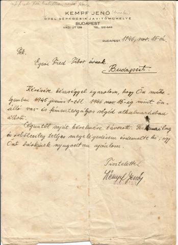 Certificado de trabalho de Tibor Freid Egedi na fábrica de automóveis Opel em Budapeste.