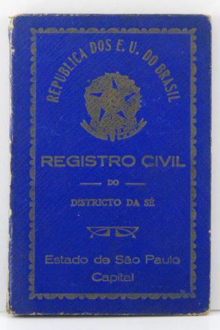 Formulário com impressos e preenchido com manuscrito com tinta ferrogálica e dois carimbos com tinta azul. Capa revestida com percalux na cor azul, com douramento da borda ornamentada, brasão e inscrições.