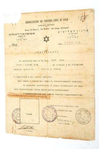 Certificado da Organização dos Refugiados Judeus na Itália de Leon Sack