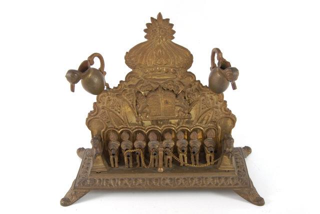 A chanukiá é um candelabro de 8 velas (mais um nono chamado shamash que serve para acender os outros oito) usado para lembrar o milagre que aconteceu na reinauguração do Templo saqueado pelos Helenistas, no qual o óleo que era suficiente para durar apenas um dia manteve a menorá (candelabro de 7 braços) acesa durante oito dias (e por isso os 8 braços deste candelabro) . A festa de Chanuká (festa das luzes) comemora a vitória dos macabeus contra o Império Helenista e a reinauguração do Templo de Jerusalem, e acenden-se as oito velas ao longo dos 8 dias de comemoração, somando sempre uma vela a cada dia. Objeto de bronze ornamentado com motivos geométricos e florais, encimado por uma coroa ladeada por dois shamashim que remetem a imagem de uma ave. No centro, Tábuas dos Dez Mandamentos ladeadas por dois Leões de Judá. Base retangular ornamentada com motivos fitomórficos, com dois leões sobre uma base quadrada, ladeando oito receptáculos com tampa em forma de leões coroados e no centro, suporte para corrente. Quatro pés ornamentados com motivos fitomórficos. Estrutura do objeto presa por porcas (no fundo da base são quinze e no verso mais duas segurando as Tábuas dos Dez Mandamentos).