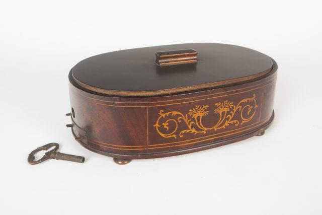 Caixa de música em madeira de formato ovalado com incrustrações nas laterais com cornuscópias com motivos florais e com volutas. Possui uma tampa e quatro pés. Funciona com o uso da chave. Pertenceu a família Born de Berlim, Alemanha.