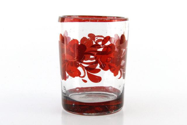 Copo de vidro com ornamento com motivos florais, friso na borda e na base com pigmento vermelho, usado no seder de pessach que é jantar de celebração que comemora a saída dos hebreus da escravidão no Egito.