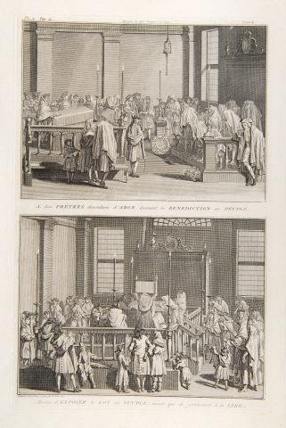 Sinagoga de judeus portugueses em Haia. Gravura representando o momento que o sacerdotes davam a benção ao povo na gravura superior e a preparação do povo para a leitura da Torá*, na gravura inferior, ambas na Sinagoga Portuguesa de Amsterdã. Composta por duas cenas horizintais; na parte superior, os sacerdotes estão dando a população. No meio da cena vemos quatro castiçais com velas acesas. Na parte superior,da direita para esquerda, um brasão na parede, uma janela de vidro, um lustre e duas colunas dóricas. A cena inferior, dentro de uma sinagoga, encontra-se uma pessoa segurando a Torá aberta ao alto e a mostrando para o povo. Ao redor dessa pessoa, adultos e crianças. No meio da cena vemos seis castiçais com velas acesas. Na parte superior, da direita para a esquerda, uma janela, um aron hakodesh com brasão na parte superior, um ner tamid, outra janela e colunas dóricas.