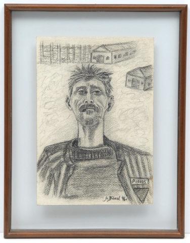 O artista Szlama Bilard desenhou o amigo que estava no campo de concentraçã na Polônia. O amigo morreu no campo e o artista fez o desenho de memória depois que foi libertado. Imagem de um homem de cavanhaque em posição frontal e duas casas e uma cerca ao fundo. Doação de Silvia E. Bigelman.