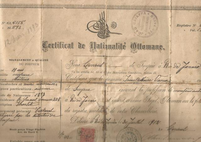 Certificado de Nacionalidade Otomana Isaac Vaena